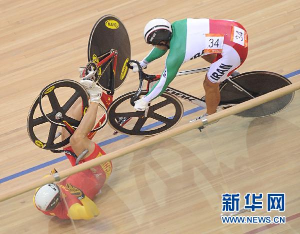 11月17日,中国选手张磊(左)在比赛中摔倒。当日,在第16届亚运会场地自行车男子凯琳赛决赛中,刚刚获得男子争先赛冠军的中国选手张磊在比赛中和马来西亚选手乔赛亚·吴安楠身体发生了轻微碰撞后,张磊摔倒在地,跟在后面的伊朗选手穆罕穆德·帕拉什躲闪不及摔倒。新华社记者李尕摄