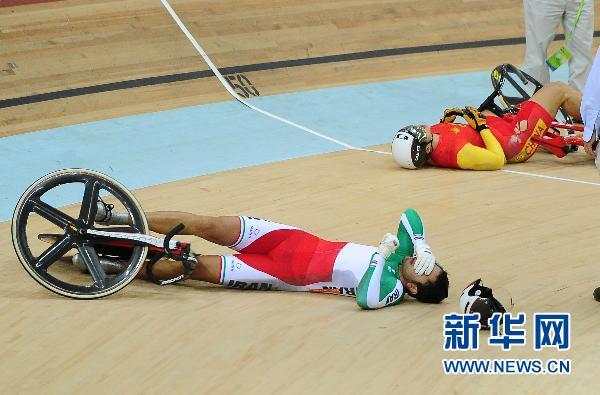 11月17日,中国选手张磊(上)和伊朗选手穆罕默德·帕拉什在比赛中摔倒后倒在场地内。当日,在第16届亚运会场地自行车男子凯林赛决赛中,刚刚获得男子争先赛冠军的中国选手张磊在比赛中和马来西亚选手乔赛亚·吴安楠身体发生了轻微碰撞后,张磊摔倒在地,跟在后面的伊朗选手穆罕穆德·帕拉什躲闪不及摔倒。新华社记者卢汉欣摄