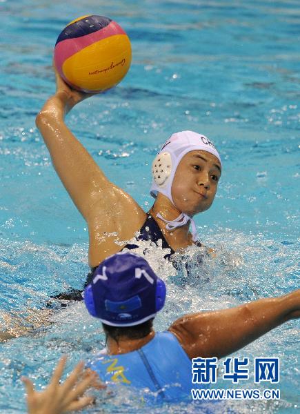 11月17日,中国队球员张蕾(上)在比赛中。当日,在广州天河游泳馆举行的第16届亚运会女子水球第6场比赛中,中国队以13比5战胜哈萨克斯坦队,最终,中国队以积6分的成绩夺得冠军。新华社记者李勇摄