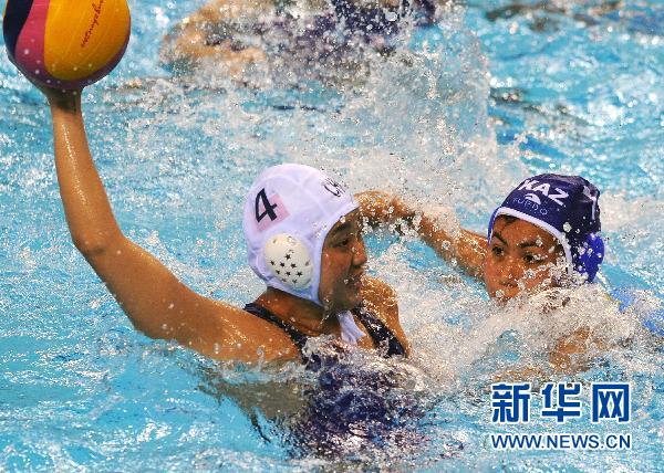 11月17日,中国队球员孙玉君(左)在比赛中射门。当日,在广州天河游泳馆举行的第16届亚运会女子水球第6场比赛中,中国队以13比5战胜哈萨克斯坦队,最终,中国队以积6分的成绩夺得冠军。新华社记者李勇摄