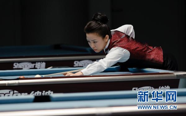 11月18日,中国选手潘晓婷在比赛中。当日,在第16届亚运会台球女子美式9球单打1/4决赛中,潘晓婷以7比6险胜韩国选手车俞岚,晋级半决赛。新华社记者姜克红摄