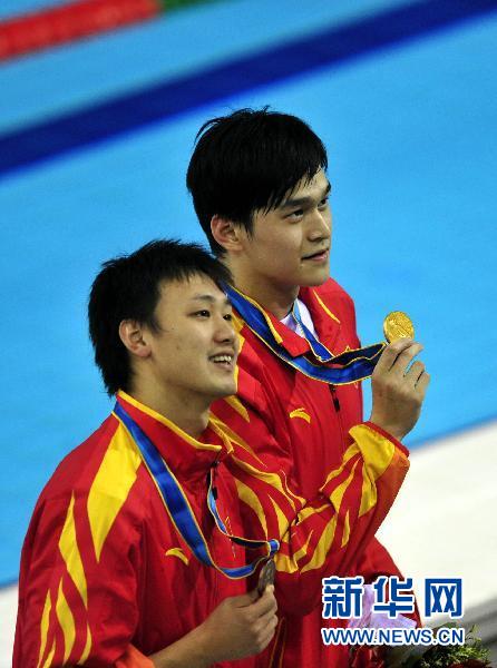 11月18日,中国选手孙杨(右)、张琳在颁奖仪式后。当日,在第16届亚运会游泳男子1500米自由泳决赛中,孙杨以14分35秒43的成绩夺得冠军,并创造了新的亚洲纪录。新华社记者陈晔华摄