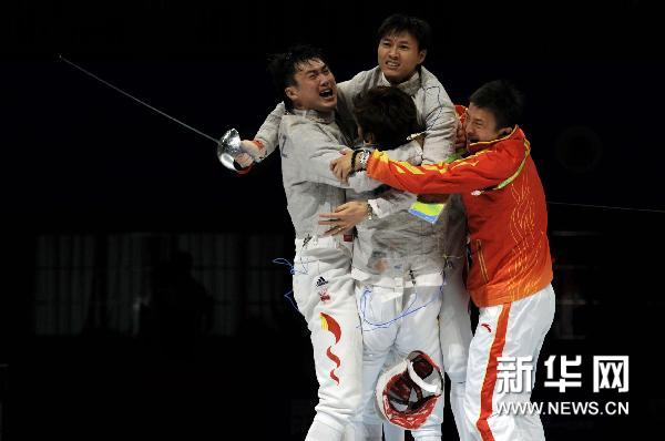 11月22日,中国队队员拥抱在一起庆祝胜利。当日,在第16届亚运会男子佩剑团体决赛中,中国队以45:44战胜韩国队,夺得冠军。新华社记者杨磊摄