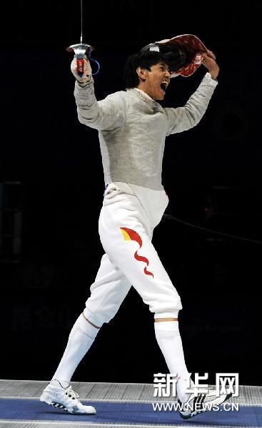 11月22日,中国队队员仲满庆祝胜利。当日,在第16届亚运会男子佩剑团体决赛中,中国队以45:44战胜韩国队,夺得冠军。新华社记者杨磊摄
