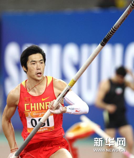 11月22日,杨雁盛在比赛中。当日,在广州奥林匹克中心体育场举行的第16届亚运会男子撑杆跳高比赛中,中国选手杨雁盛夺得冠军。新华社记者廖宇杰摄