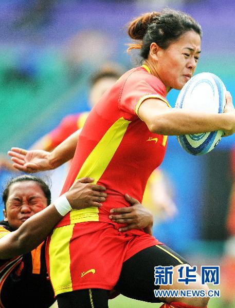 11月22日,中国队球员孙婷婷(右)在比赛中。当日,在第16届亚运会女子橄榄球预赛A组比赛中,中国队以36比0战胜泰国队。新华社记者徐家军摄