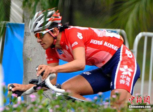 11月22日,广州亚运会公路自行车男子公路个人赛在广州大学城铁人三项场进行,中国香港选手黄金宝以4小时14分54秒182的成绩夺得冠军。中新社记者王东明摄