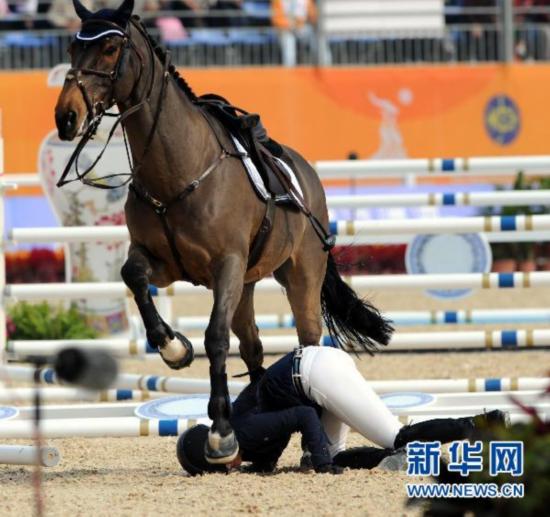 11月22日,中华台北选手汪亦岫在比赛中被摔落马下。当日,在第16届亚运会马术场地障碍赛个人资格赛第一轮比赛中,中华台北选手汪亦岫被摔落马下,随即被送往医院救治。新华社记者杨宗友摄