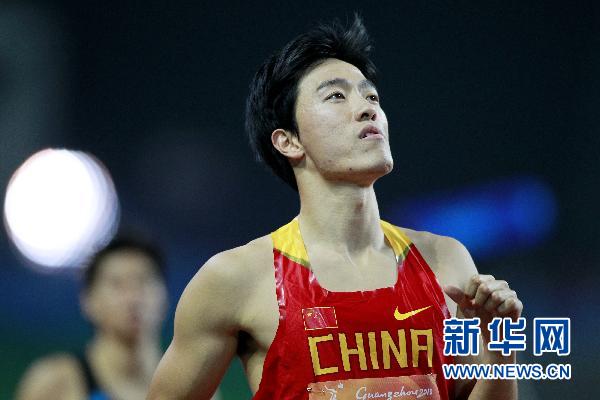 11月22日,中国选手刘翔在男子110米栏预赛中。当日,在广州进行的第16届亚运会男子110米栏预赛中,刘翔以13秒48位列小组第一,轻松晋级决赛。新华社记者任正来摄
