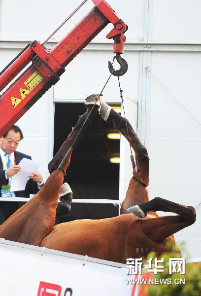 11月23日16时许,哈萨克斯坦选手加林娜·多尔古申娜在现代五项中所乘的赛马因伤势过重已被实施安乐死。这是死亡后的马匹被卫生处理车从比赛场地运走。当日14时40分左右,在女子现代五项马术场地障碍赛中,加林娜·多尔古申娜在骑马跨越一个障碍后,随马一同头部朝下栽倒在地。多尔古申娜很快被赛场救护车送往医院治疗。她所骑乘的D252号马也倒地不起,被拖至场边接受诊治。新华社记者徐家军摄