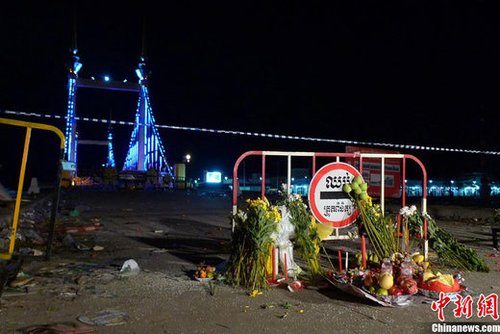 当地时间11月23日,柬埔寨金边市发生逾千人死伤的踩踏事件后,当局已在发生惨剧的钻石大桥前拉起警戒线,有市民在警戒线前献上鲜花及果品致祭事件中的罹难者。中新社发周志彬摄