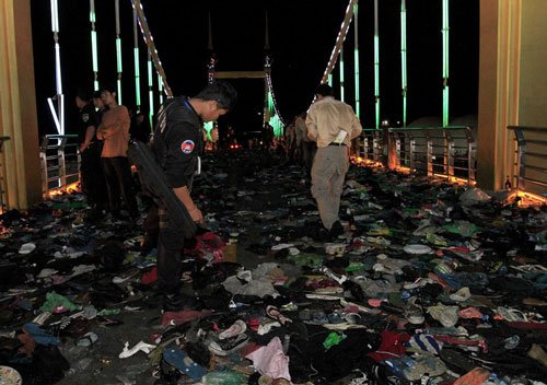 柬埔寨踩踏桥上堆满鞋 CNN称警方开水枪导致