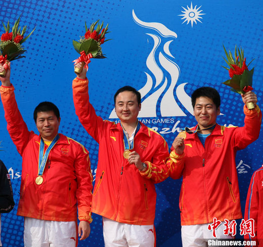 11月18日,射击男子25米中心发火手枪赛事在广州奥体射击馆举行,中国运动员刘亚东、金泳德、李传林以1743—64X的总分获男子团体冠军。他们的精确度总分为866,快速分为877。获得银牌是来自韩国的运动员代表,获得铜牌是朝鲜运动员代表。 中新社记者 张茵 摄