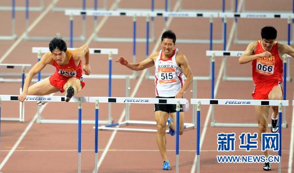 11月24日,刘翔(左)在比赛中。当日,在广州奥林匹克中心体育场举行的第16届亚运会男子110米栏决赛中,中国选手刘翔以13秒09的成绩夺得冠军。新华社记者杨世尧摄