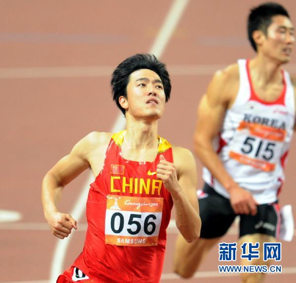 11月24日,刘翔冲过终点。当日,在广州奥林匹克中心体育场举行的第16届亚运会男子110米栏决赛中,中国选手刘翔以13秒09的成绩夺得冠军。新华社记者杨世尧摄