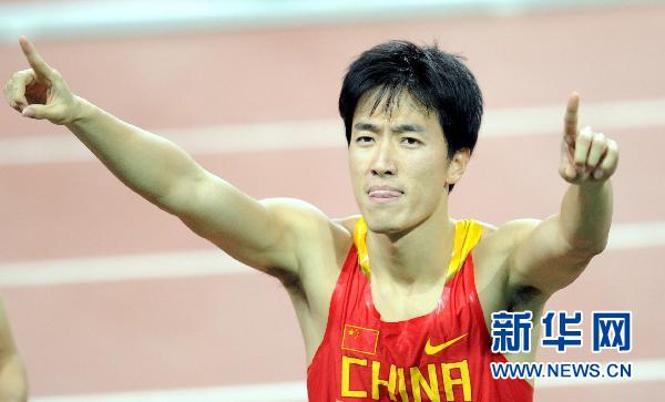 11月24日,刘翔庆祝夺冠。当日,在广州奥林匹克中心体育场举行的第16届亚运会男子110米栏决赛中,中国选手刘翔以13秒09的成绩夺得冠军。新华社记者杨世尧摄