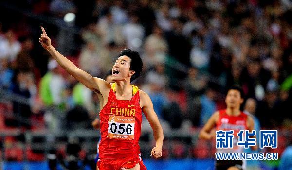 11月24日,刘翔庆祝夺冠。当日,在广州奥林匹克中心体育场举行的第16届亚运会男子110米栏决赛中,中国选手刘翔以13秒09的成绩夺得冠军。新华社记者吴晓凌摄