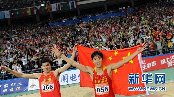 11月24日,刘翔(右)在夺冠后与队友史冬鹏庆祝。当日,在广州奥林匹克中心体育场举行的第16届亚运会男子110米栏决赛中,中国选手刘翔以13秒09的成绩夺得冠军。新华社记者李钢摄