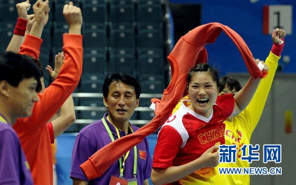 11月25日,中国队球员韦秋香(右二)和队友庆祝胜利。当日,在第16届亚运会女子手球半决赛中,中国队以24比18战胜哈萨克斯坦队,挺进决赛。新华社记者格桑达瓦摄