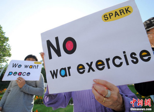 韩国反战人士在国防部门前集会抗议美韩联合军演。