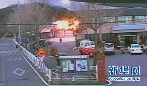 11月23日的电视截图显示的是韩国西部延坪岛上遭到炮击的瞬间