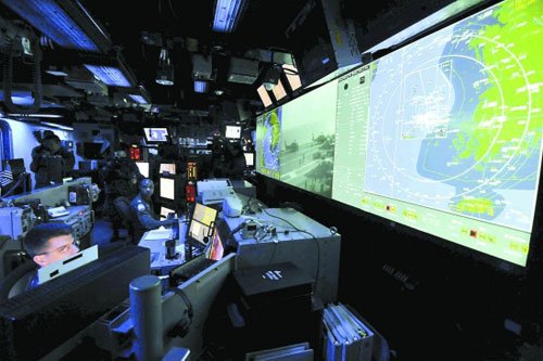 11月29日,美国海军军官观看大屏幕,监察美韩军演情况。 人民图片供图