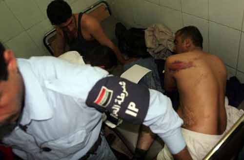 2005年11月,伊拉克的一名警察在位于巴格达的亚莫克医院展示他身上的淤伤。