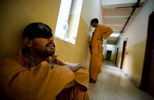 2007年8月,在伊拉克国家警察局所属的青年监狱内,两名嘴唇干裂的囚犯正在等候审讯。