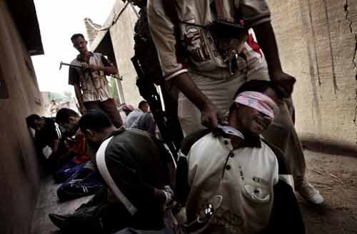 2007年9月,在巴格南部郊外的哈瓦拉-哈贾布村,一名协助美军和伊拉克政府军作战的逊尼派“志愿者”抓住一名武装分子的头发,并威胁要用刀割断他的脖子。