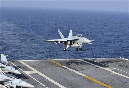美军一架超级大黄蜂战机准备在华盛顿号航母上着陆