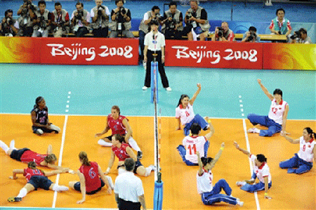 残奥会坐式排球比赛方式与奥运会排球比赛方式基本相同,但有部分特殊规定:例如坐式排球的比赛场地小于6人排球比赛场地;在比赛过程中运动员需坐在地上进行比赛,其臀部必须保持与地面接触,不允许站立和行走;在没有妨碍对方完成技术动作的情况下,允许队员的手和脚越过中线;防守队员可以直接拦截发球等。