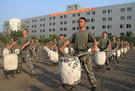 每天早上5点,紧密排列的六层宿舍楼里,灯光齐刷刷地亮起,随之,在地面混合着煤渣和沙子的简易操场上,来自广州军区75200部队的数百名士兵演员迅速集合、列队、摆阵型,一天的训练开始了。12月的广州依旧寒冷未至,温暖舒适的气候多少让这群年轻的战士感到欣慰。