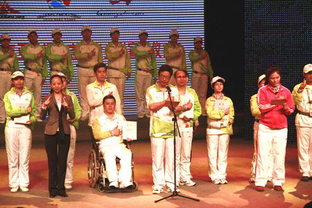 现场全体亚残运会志愿者在亚残运会形象大使白岩松、邰丽华、周扬静的带领下集体誓师上岗,正式完成亚运时间向亚残时间的转换,标志着亚运志愿服务全面转入“亚残运时间”。