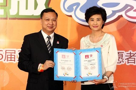 由广州亚组委志愿者部、广州团市委主办的“2010广州亚运会、亚残运会赛会版、航空版志愿彩”今日发布。吴小莉出席发布会,并接受亚组委志愿者部部长、团市委书记王焕清颁发的《亚运志愿者爱心大使》证书。