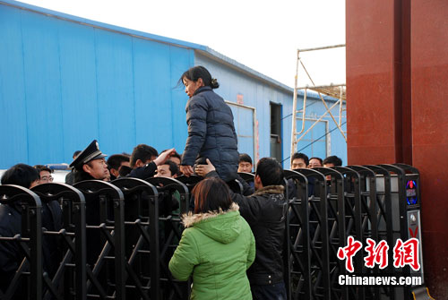 在双方僵持不下的情况下,这名记者想翻门进入,但遭到数名看大门人的人墙式的阻拦。 经过反复僵持、协商,终于有一名记者被允许翻门进入。