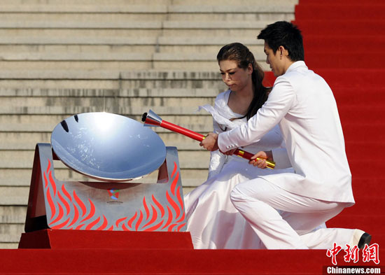 12月3日,采火使者阿迪兰(左)和周嘉威成功采集亚残运会火种。当日,广州2010年亚洲残疾人运动会火种采集仪式在北京中华世纪坛举行。两名采火使者分别是来自新疆特殊教育职业中学的学生阿迪兰和广州亚运会三枚金牌得主游泳名将周嘉威。中新社记者 刘震 摄