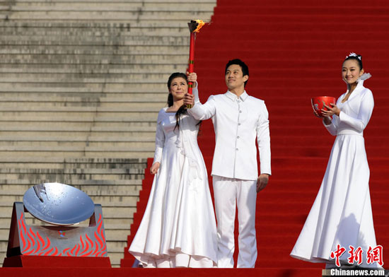 12月3日,采火使者阿迪兰(左)和周嘉威成功采集亚残运会火种。当日,广州2010年亚洲残疾人运动会火种采集仪式在北京中华世纪坛举行。两名采火使者分别是来自新疆特殊教育职业中学的学生阿迪兰和广州亚运会三枚金牌得主游泳名将周嘉威。中新社记者 刘震 摄