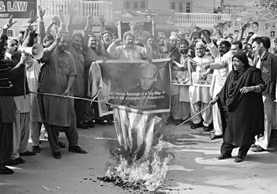 巴基斯坦民众焚烧美国国旗,以示支持阿桑奇。
