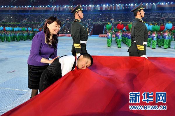 12月12日,视障儿童何宇轩(左二)在开幕式上深情地将脸颊贴在国旗上。当日,2010年亚残运会开幕式在广州举行。 新华社记者刘大伟摄