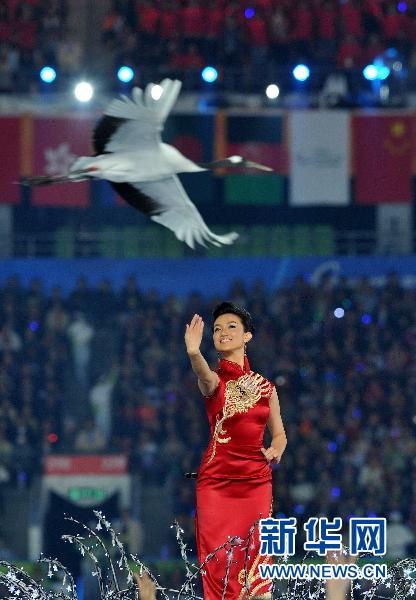 12月12日,2010年亚残运会开幕式在广州举行。这是一只仙鹤从中国残疾人艺术团的手语主持人姜馨田面前飞过。此时的姜馨田正邀请大家跟着她的手语,大声说出——妈妈我爱你!朋友我爱你!世界我爱你! 新华社记者刘大伟摄