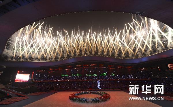 12月12日,2010年亚残运会开幕式在广州举行。这是开幕式前的倒计时表演《奔跑》和焰火表演。 新华社记者卢汉欣摄