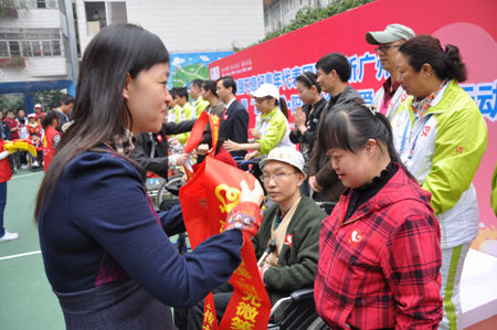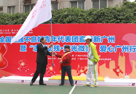昨日,在广州市越秀区启智学校,中共广州市委常委、市委组织部部长方旋,中国残疾人联合会组联部主任张仪凤,中国残疾人联合会组联部副巡视员郝尔康,团广东省委副书记曾颖如,亚残运会组委会志愿者部部长、共青团广州市委书记王焕清,越秀区委副书记、代区长杨雁文等领导共同启动全国自强不息好青年代表团喜看新广州暨“志愿助残阳光微笑”爱心广州行动。代表团成员金晶宣读爱心广州行动倡议。12名代表团成员全部担任宣传大使,领导为其颁发绶带和“志愿助残阳光微笑”爱心卡。市委常委、市委组织部部长方旋为爱心广州行动授旗,代表团成员、中国特奥会特奥之星、国际特奥会形象大使、全国自强模范马芸莉上台接旗,本次爱心广州行动启程,代表团成员表示将把爱心卡带到全国各地,将“志愿助残?阳光微笑”爱心行动扩散到全国各地。