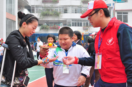 金晶与特殊儿童、志愿者一起体验校园趣味“亚残运会”