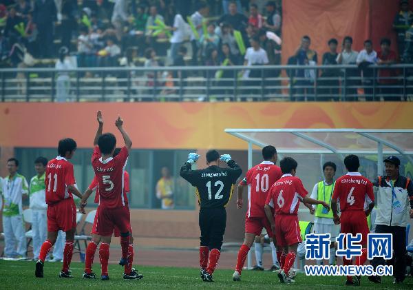 12月13日,中国队球员在比赛结束后向观众致意。当日,在广州2010年亚残运会七人制足球首场比赛中,中国队以4比2战胜韩国队,首战告胜。新华社记者韩传号摄
