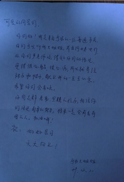 众多捐赠者信件里的一封,落款为宁波大姐姐,代表了很多宁波市民的心声。