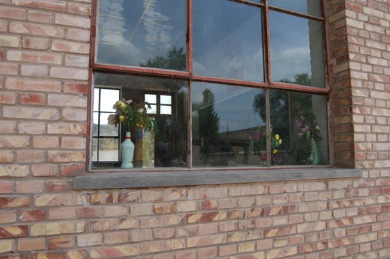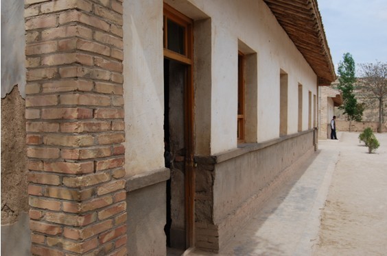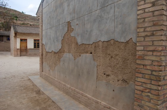 近景,泥土和着稻草的墙壁,外面包的水泥已经严重脱落,一片一片的。