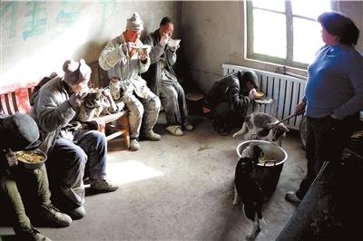 14时,老板娘唤工人吃饭,大家似乎不习惯这个时间吃饭,老板娘喊了几遍,工人才回房间拿饭盆。“今天要好点,面里有油。”装面条的大铝锅放在地上,老板娘一勺勺舀给工人。两条狗进进出出,时不时舔着面条。老板娘举着大勺,冲狗叫了一声,见狗不离开,也就不再管了。
