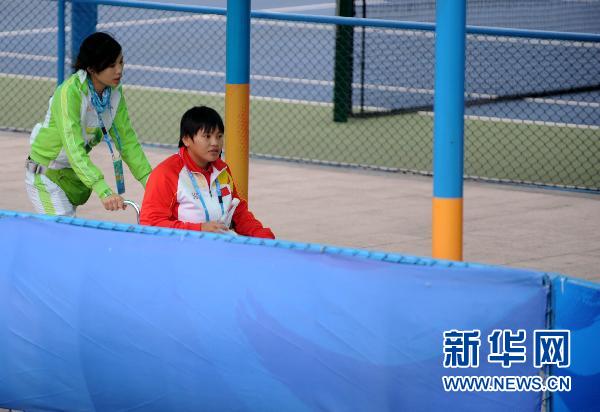 12月14日,一名志愿者在赛场推送一名轮椅网球运动员。在广州2010亚残运会轮椅网球赛场,众多志愿者分布在赛场内外,为轮椅运动员提供全方位的服务。 新华社记者岳月伟摄