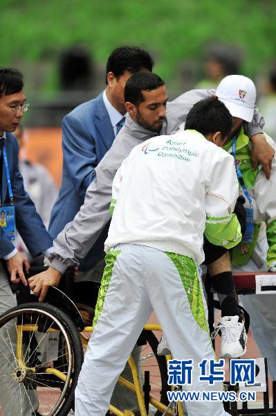 12月14日,两位志愿者和两位技术官员一同帮助一位参加男子铅球比赛的选手坐上比赛台。在广州2010亚残运会标枪和铅球一些级别的比赛中,选手们配有专用的比赛台,以坐姿参赛。赛场的志愿者们和技术官员为运动员服务,帮助运动员从轮椅上转移到比赛台上进行比赛。新华社记者陈晔华摄