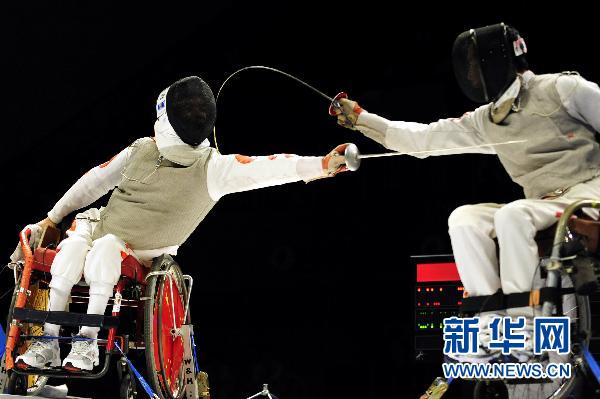 12月14日,中国选手胡道亮(左)在比赛中。当日,在广州广大体育馆举行的2010年亚残运会轮椅击剑男子个人花剑B级决赛中,中国选手胡道亮战胜中国香港选手钟定程,获得冠军。新华社记者梁旭摄